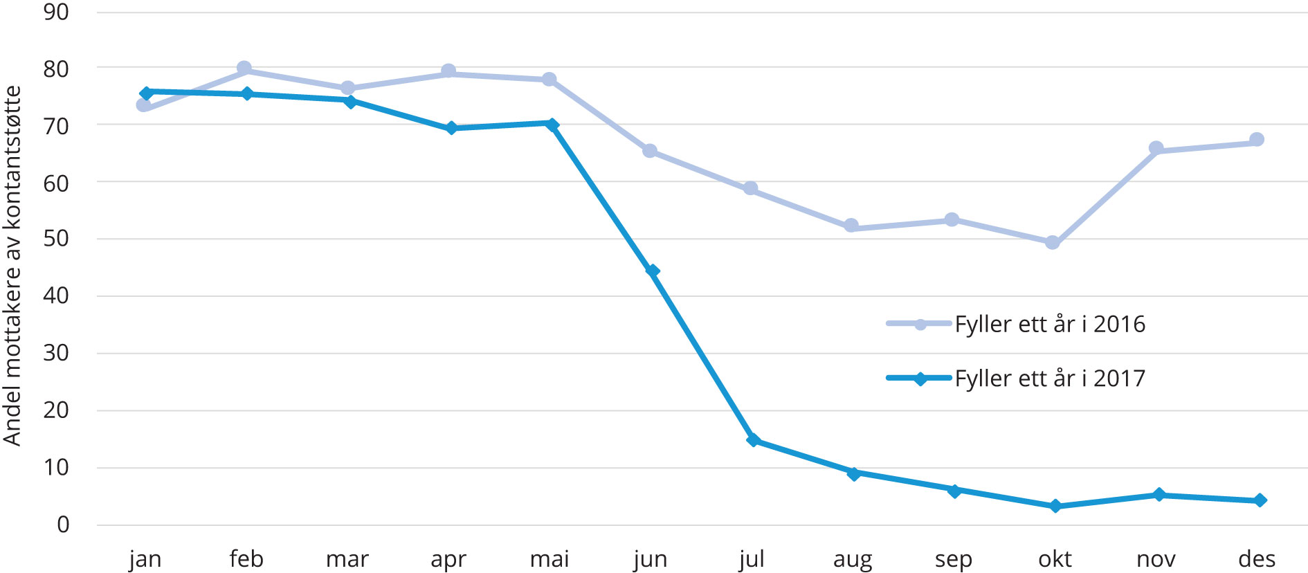 Figur 2. Mottak av kontantstøtte etter hvilken måned barnet fyller ett år. Andel som mottok minst en måned kontantstøtte. Prosent.