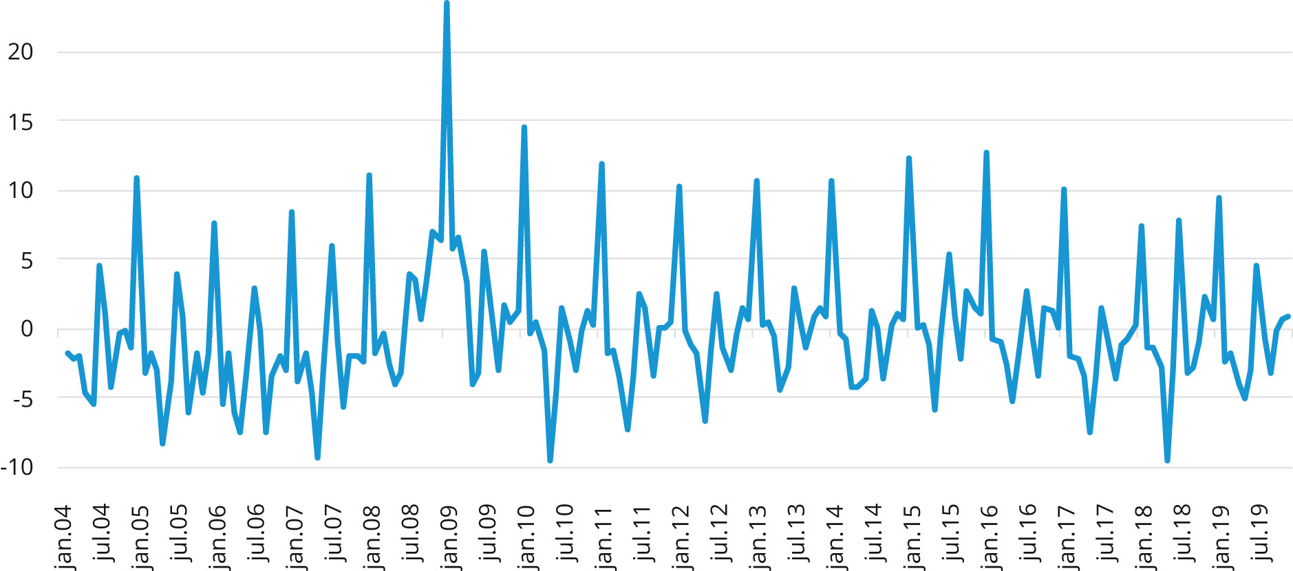 Figur 2. Den prosentvise endringen i bruttoledigheten, Feb. 2004 – Des. 2019.