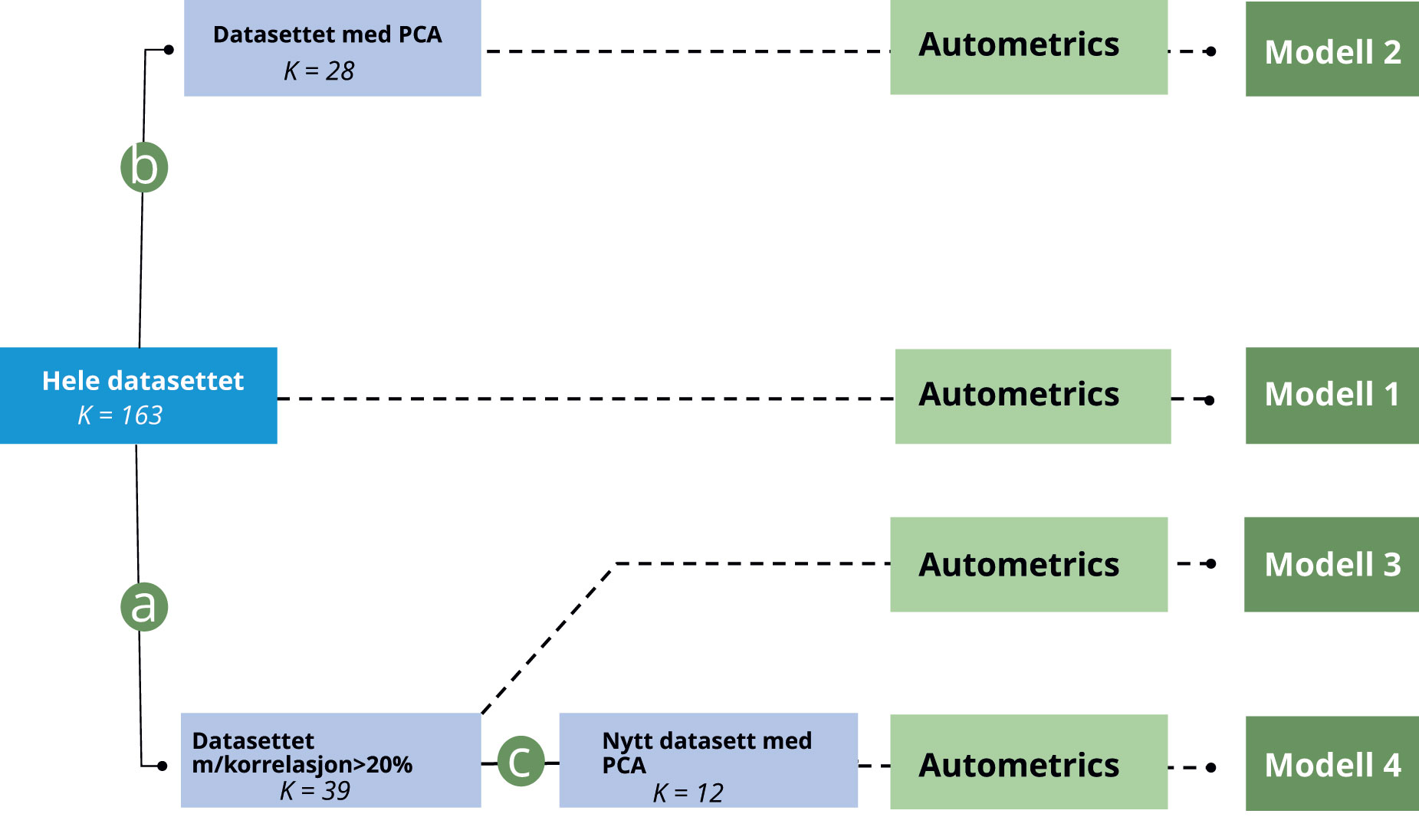 Figur 3. Kart over datasettene. Kartet leses fra venstre til høyre. Til venstre, har vi «Hele datasettet» med alle 144 Google Søketrend-variablene og 19 dummy-variabler og interaksjonsledd. Når vi beveger oss mot høyre, blir datasettet delt inn i tre nye datasett med færre forklaringsvariabler; «PCA», «Korrelasjon» og «Nytt datasett med PCA». I siste steg, bruker vi en automatisk algoritme (Autometrics) for å trekke ut de variablene, i hvert enkelt datasett, som skal inkluderes i den endelige prognosemodellen helt til høyre i fremstillingen.