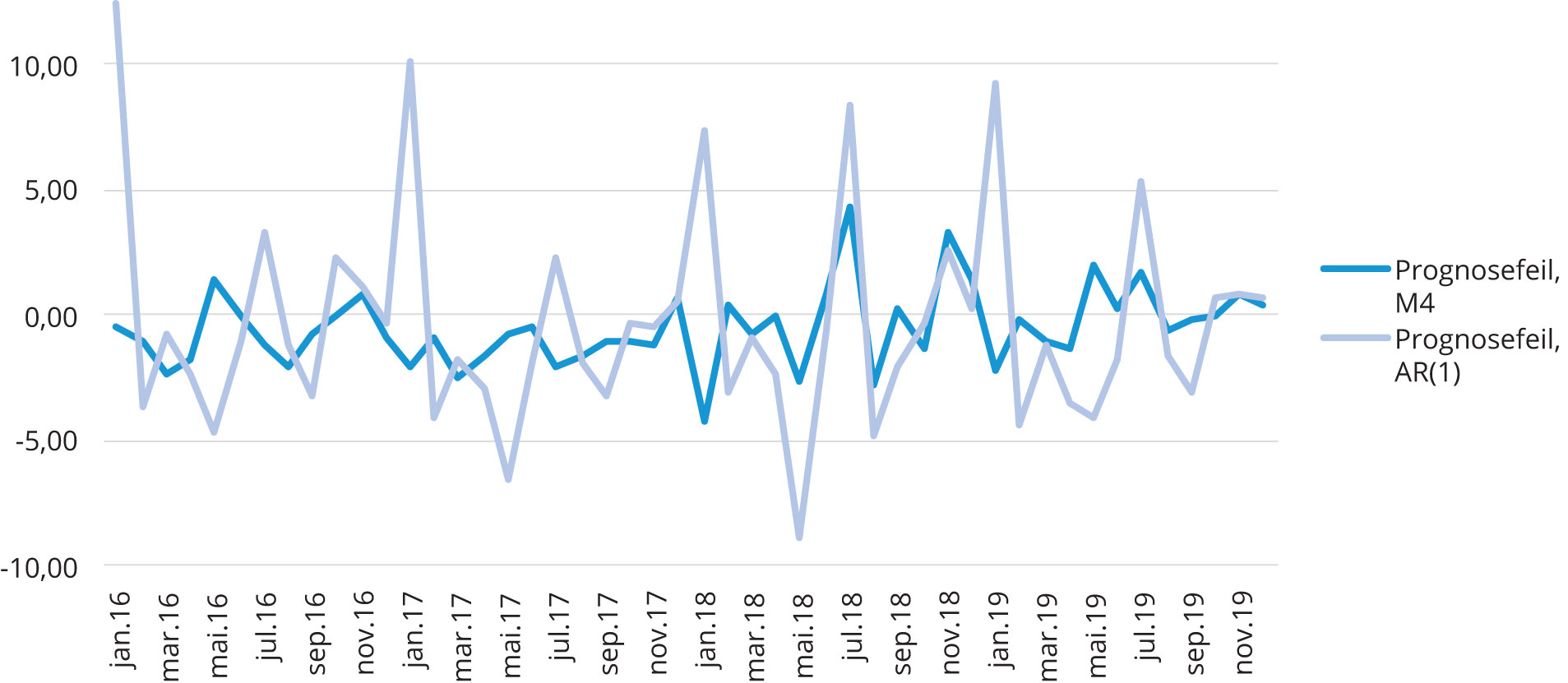 Figur 4 viser prognosefeilen til to modeller grafisk over tid. Her representerer den mørkeblå grafen avviket mellom den realiserte veksten i arbeidsledigheten og prognosen til modell 4. Grafen svinger balansert rundt x-aksen uten store og uregelmessige hopp. Sammenligner vi dette med avviket mellom realisert arbeidsledighet og prognosen til AR(1)-prosessen viser figuren større og mer uregelmessige svingninger rundt x-aksen. AR(1)-modellens prognoser bommer med andre ord klart kraftigere og oftere enn prognosene laget av modell 4.