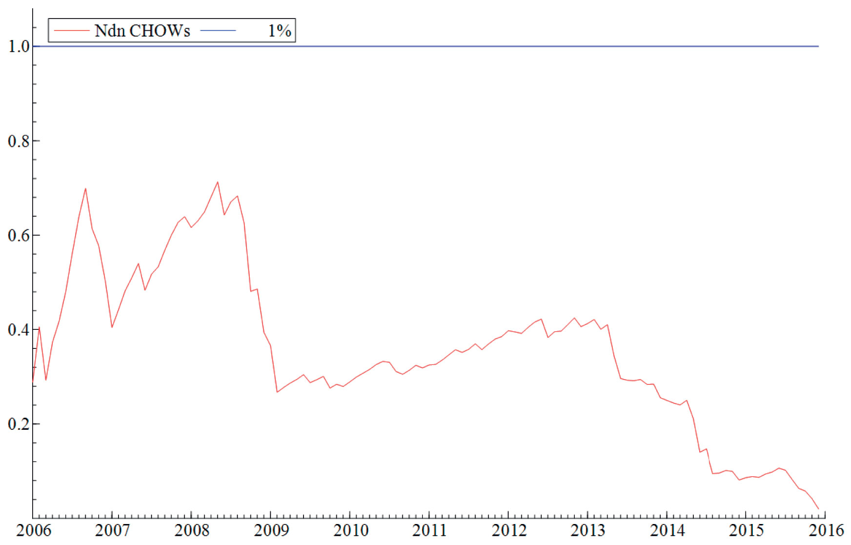 Ettersom de fire datasettene inkluderer såpass ulikt antall variabler bør jeg velge forskjellige signifikansnivåer i hver av de fire modellestimeringene. Hele datasettet (det lysegrå rektangelet helt til venstre i Figur 3) inneholder totalt 510 variabler noe som (antagelig) er for mange variabler for å kunne lage en god prognosemodell. Et høyt antall variabler taler for å ta i bruk et lavt eller strengt signifikansnivå for å unngå en for høy akkumulering av type-I feil. Jeg bestemmer derfor at alle variabler i den endelige modellen minst skal ha et signifikansnivå på 0,01 prosent. Med dette signifikansnivået viser Hendry og Nielsen (2007, Kap 19.3) at den endelige modellen vil inkludere 0,0001*510 = 0,051 irrelevante variabler og sannsynligheten for type-I feil er 4,9 prosent, som er relativt lavt.