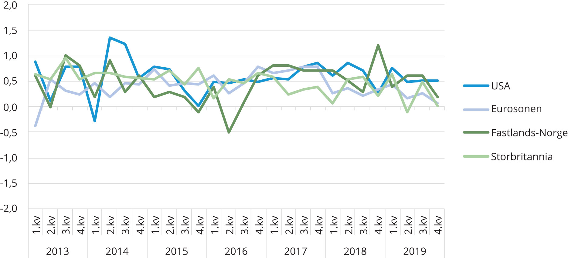 Den moderate oppgangskonjunkturen som begynte i slutten av 2016 fortsatte i 2019. Årsveksten i bruttonasjonalprodukt (BNP) for Fastlands-Norge ble på 2,3 prosent, litt høyere enn i 2018 da den var på 2,2 prosent, og høyere enn trendveksten for fastlandsøkonomien.[7] Trendveksten er en estimert størrelse. SSBs estimat av den årlige trendveksten for BNP Fastlands-Norge er på 2 %. En oppgangskonjunktur er definert som en periode der veksten i BNP for Fastlands-Norge er høyere enn trendveksten. Veksten i norsk økonomi avtok imidlertid mot slutten av året. BNP for Fastlands-Norge økte med 0,2 prosent i fjerde kvartal, ifølge sesongjusterte tall fra nasjonalregnskapet (tabell 2). Dette er en lavere veksttakt enn i de to foregående kvartalene, da fastlands-BNP steg med 0,6 prosent. Høyere aktivitet i de private tjenestenæringene var det viktigste bidraget til veksten i fastlandsøkonomien i fjerde kvartal, selv om veksten der også var noe lavere enn i de foregående kvartalene. Bruttoproduktet i industrien økte med bare 0,2 prosent og bidro i mindre grad til veksten i fastlandsøkonomien. Det var en nedgang i produksjonen i de fleste industrinæringene, bortsett fra oljeleverandørene, der særlig verftsindustri hadde god vekst i fjerde kvartal. Innen bygg og anlegg var det også lavere vekst i fjerde kvartal enn tidligere i 2019, mens det var en nedgang i produksjonen innen fiskeri, akvakultur og elektrisitetsproduksjon. Dette trakk ned veksten i fastlandsøkonomien.