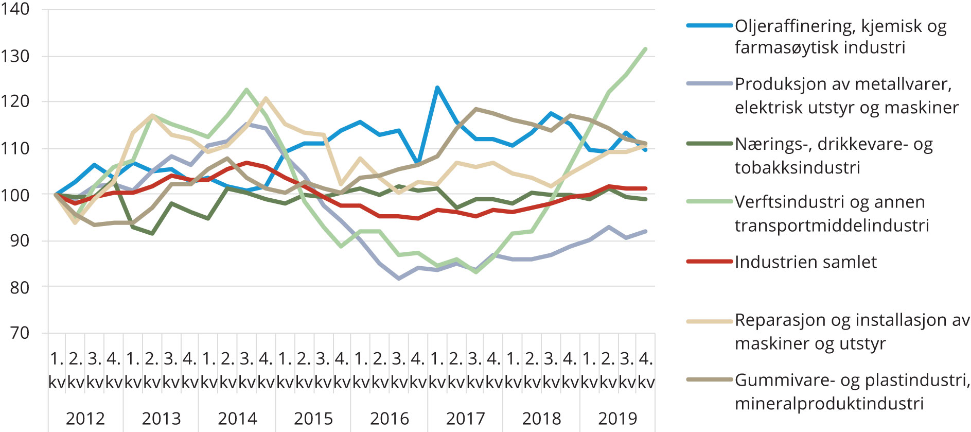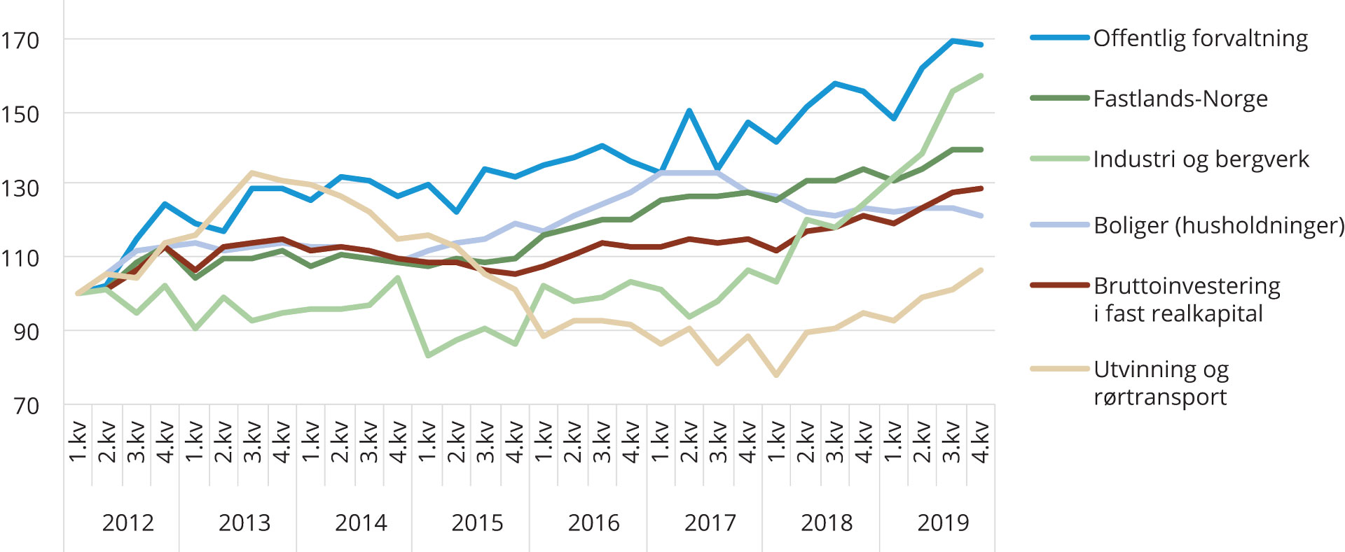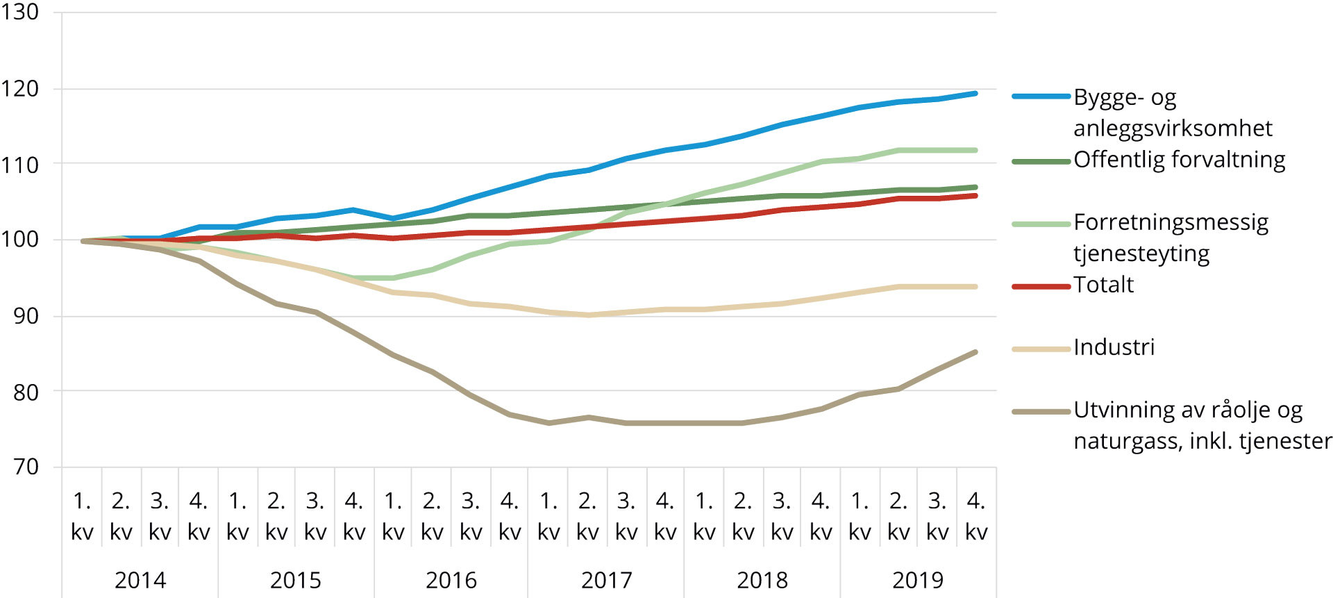 Sysselsettingen i Norge har tatt seg opp i løpet av de siste tre årene etter svak vekst i 2015 og 2016. Vi benytter sysselsettingstall fra to ulike kilder: nasjonalregnskapet (NR) og arbeidskraftundersøkelsen (AKU). Ifølge de sesongjusterte tallene fra nasjonalregnskapet har sysselsettingen de tre siste årene økt med om lag 11 000 personer i gjennomsnitt hvert kvartal (figur 1). Fra første kvartal 2018 til andre kvartal 2019 var det en markant vekst med 72 000 flere sysselsatte, før veksten begynte å avta i tredje og fjerde kvartal 2019. Det er primært næringer som offentlig forvaltning, bygg og anlegg og utvinning av råolje og naturgass samt tilknyttede tjenester som hadde sterkest vekst det siste året. Disse næringene har stått for 46 prosent av den totale veksten i sysselsettingen siden første kvartal 2019. I 2019 har sysselsettingsveksten i bygg og anleggssektoren gått noe ned. Dette har sammenheng med nedgangen i boliginvesteringene, som i gjennomsnitt ble 0,5 prosent lavere i 2019 enn i 2018. Etter tre år med nedgang begynte sysselsettingen i industrien å øke i tredje kvartal 2017. Veksten vedvarte gjennom 2018 og i begynnelsen av 2019 før den viste nullvekst i tredje og fjerde kvartal. Dette henger sammen med en svakere utvikling i industriproduksjonen. Særlig oljeraffinering, kjemisk og farmasøytisk industri, næringsmiddelindustri samt produsenter av metaller opplevde en markert nedgang fra tredje til fjerde kvartal 2019, mens næringene tilknyttet oljeindustrien bidro til å dra veksten opp i samme periode. Etter en lang periode med nedgang, tok sysselsettingen innen utvinning av olje og naturgass og tilknyttede tjenester seg opp i midten av 2018 og veksten har vedvart gjennom hele 2019. Dette har sammenheng med at petroleumsinvesteringene har fortsatt å stige i løpet av fjoråret og kan særlig knyttes til igangsettingen av Johan Sverdrup-feltet.