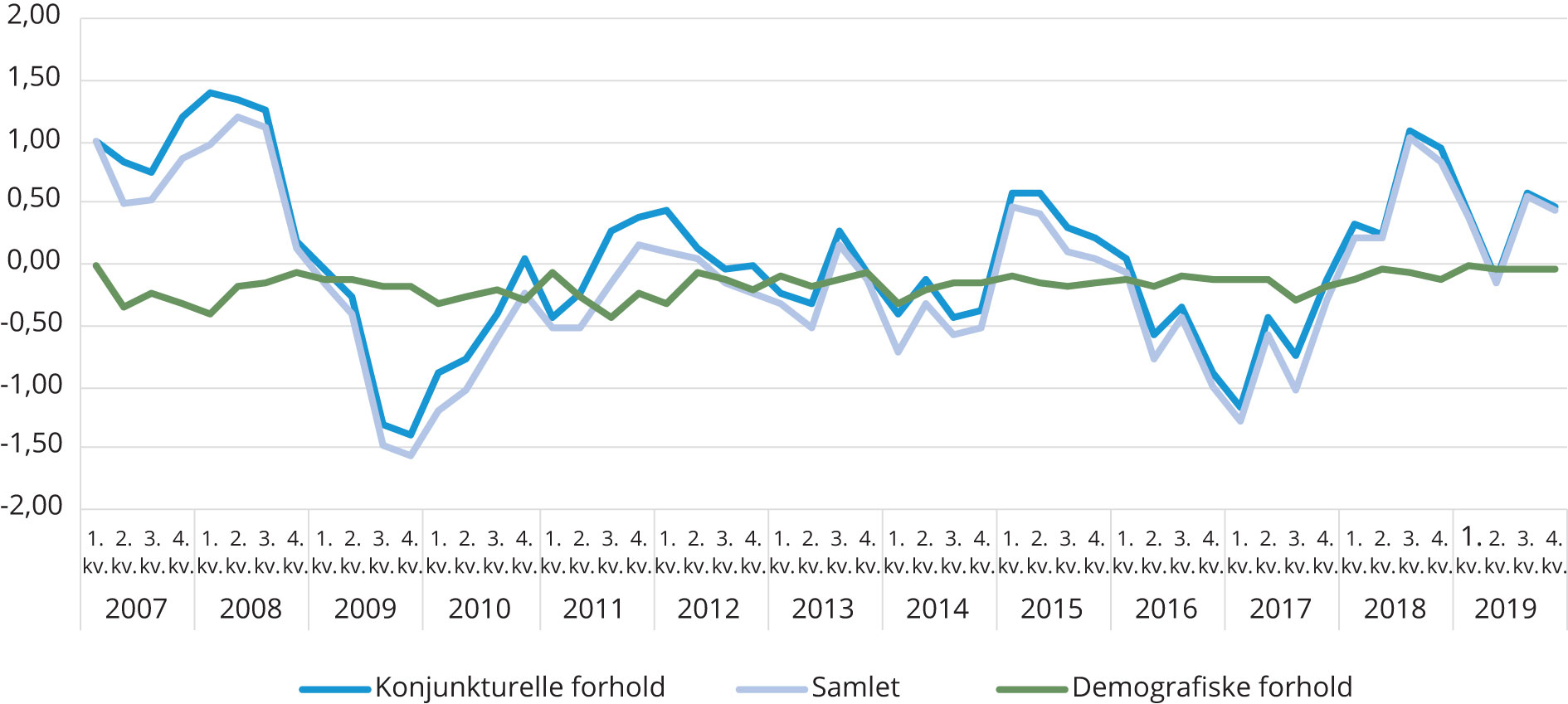 Utviklingen i yrkesdeltakelsen påvirkes først og fremst av demografiske forhold og konjunkturelle forhold. Endringene i alderssammensetningen i befolkningen over tid utgjør de demografiskeforholdene. En større andel eldre eller yngre vil isolert sett medføre lavere samlet yrkesdeltakelse, siden disse gruppene har en lavere yrkesdeltakelse enn gjennomsnittet. Andelen som tilhører den eldste aldersgruppen har økt de siste årene, noe som har bidratt til å redusere samlet yrkesdeltakelse. Figur 4 viser at i gjennomsnitt for perioden 2007–2017 har demografiske forhold redusert yrkesandelen med nesten 0,2 prosentpoeng hvert år. Denne effekten var klart mindre allerede i 2018, og i 2019 har demografiske forhold praktisk talt ikke påvirket den samlede yrkesdeltakelsen.