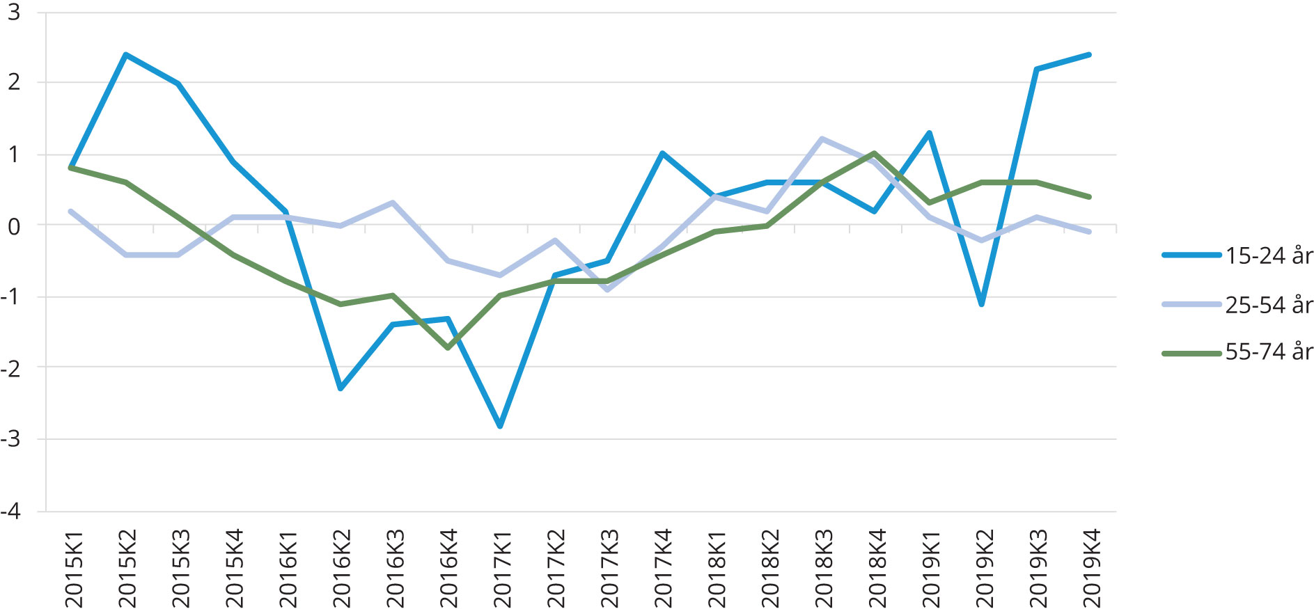 Endringene i yrkesdeltakelsen over tid for de ulike aldersgruppene utgjør de konjunkturelle forholdene. Historiske tall viser at konjunkturene påvirker yrkesdeltakelsen slik at den synker når etterspørselen etter arbeidskraft er lav og ledigheten økende. Størrelsen på denne responsen varierer mellom aldersgrupper, men er vanligvis størst blant de yngste (figur 5). Ser vi nærmere på utviklingen fra fjerde kvartal 2018 til fjerde kvartal 2019, var det en økning i yrkesdeltakelsen i aldersgruppene 15–24 år og 55–74 år. Økningen var klart størst i aldersgruppen mellom 15 og 24 år med hele 2,4 prosentpoeng. Det var også en klar økning i yrkesdeltakelsen blant dem mellom 55 og 74 år, med 0,4 prosentpoeng. For dem mellom 25 og 54 år ble yrkesdeltakelsen redusert med 0,1 prosentpoeng i denne perioden.