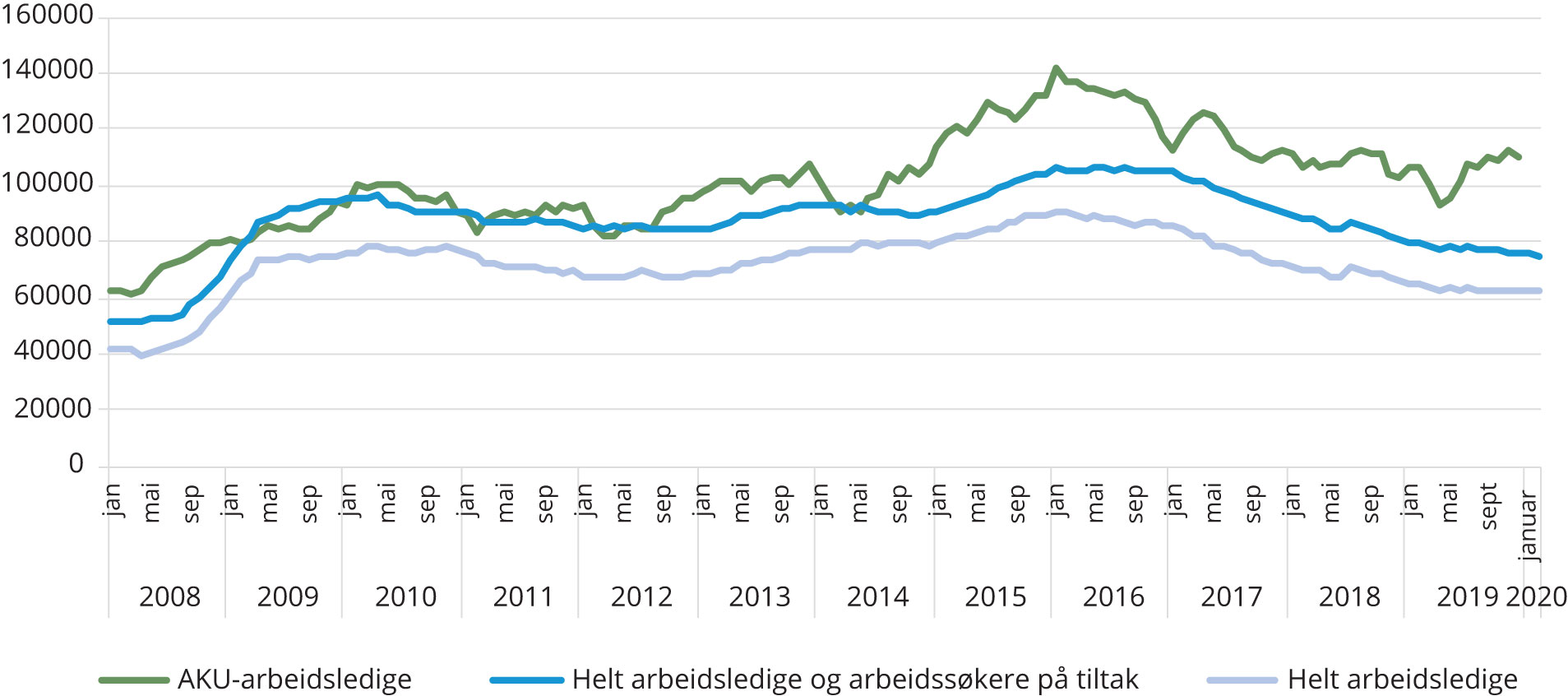 Under den forrige nedgangskonjunkturen økte arbeidsledigheten målt ved AKU tidligere og betydelig mer enn den registrerte ledigheten, og det oppsto et uvanlig stort avvik mellom de to målene (se faktaboks To mål på arbeidsledigheten i Norge). I januar 2016 nådde AKU-ledigheten toppen på 5,1 prosent av arbeidsstyrken, og viste en betydelig nedgang de påfølgende to årene. Fra midten av 2018 til og med desember 2019 har AKU-ledigheten vekslet mellom oppgang og nedgang. Samlet sett har trenden vært synkende gjennom hele 2018 og første halvdel av 2019, før den tok seg opp igjen i andre halvdel av 2019. I desember 2019 var AKU-ledigheten på 3,9 prosent av arbeidsstyrken, ifølge sesongjusterte tall. Gapet mellom AKU-ledigheten og den registrerte ledigheten har blitt noe mindre siden begynnelsen av 2016, men er fortsatt stort, sett i et historisk perspektiv.