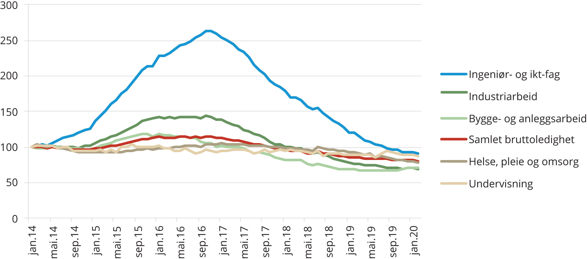Den siste oljedrevne nedgangskonjunkturen innebar en stor økning i ledigheten blant ingeniører (figur 8). Fra januar 2014 til oktober 2016 økte bruttoledigheten innen yrkesgruppen ingeniør- og ikt-fag med 163 prosent, og det var særlig for ingeniører og sivilingeniører innen oljerelaterte fag at ledigheten økte mest. Siden toppen høsten 2016 har bruttoledigheten innen ingeniør -og ikt-fag gått ned. Ved utgangen av februar var det registrert 23 prosent færre helt ledige og arbeidssøkere på tiltak med denne yrkesbakgrunnen enn i februar i fjor. Ingeniør- og ikt-fag er dermed den yrkesgruppen med størst nedgang i bruttoledigheten det siste året. Som prosent av arbeidsstyrken var bruttoledigheten blant ingeniører på 1,3 prosent i februar. Dette er 1,6 prosentpoeng lavere enn landsgjennomsnittet på 2,9 prosent.