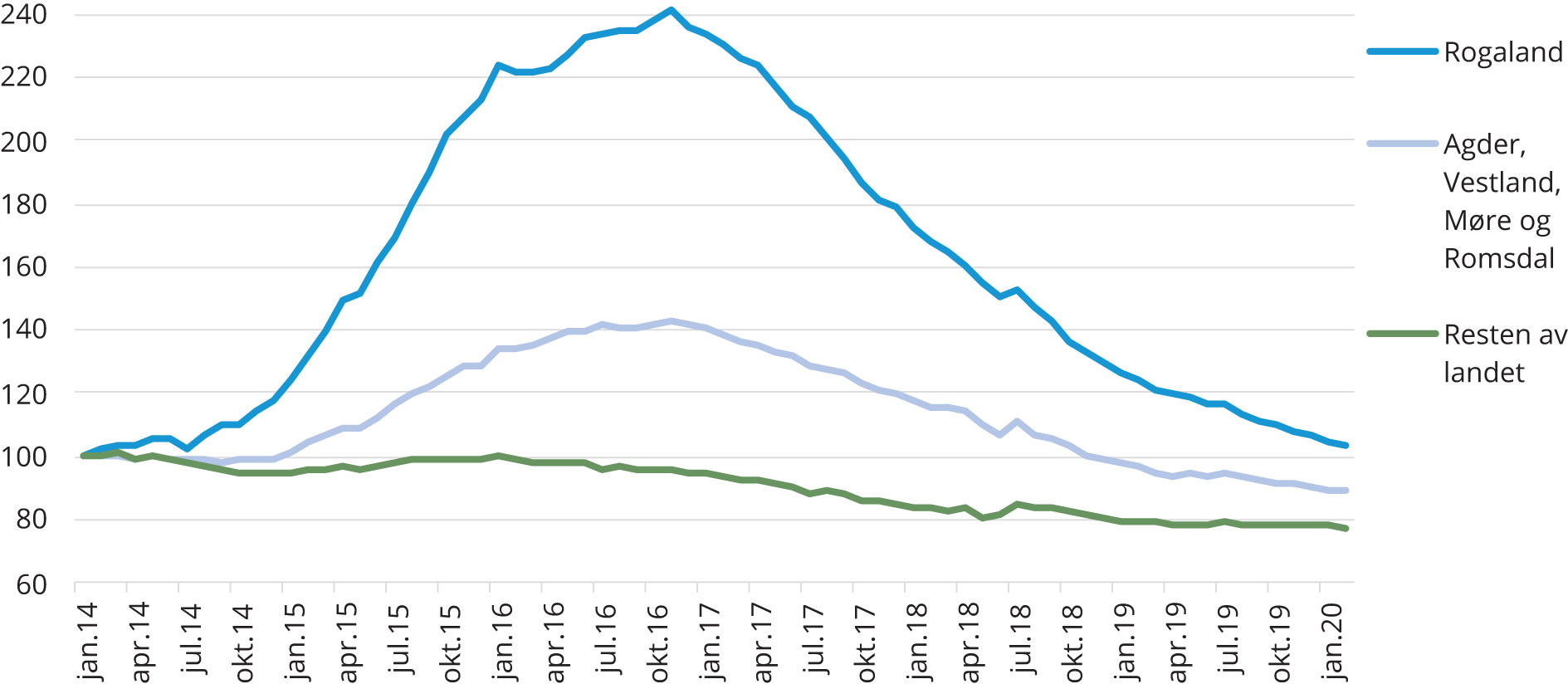 Nedgangen i oljebransjen og oljerelatert industri rammet hovedsakelig Sør- og Vestlandet og særlig Rogaland, noe som førte til store geografiske forskjeller i arbeidsmarkedet. I Rogaland ble bruttoledigheten mer enn doblet fra januar 2014 til november 2016 (figur 9) og Rogaland gikk fra å være fylket med nest lavest ledighet til å ha den høyeste ledigheten i landet. Resten av landet var samlet sett lite påvirket av nedgangskonjunkturen, og bruttoledigheten holdt seg relativt stabil i denne perioden før den begynte å synke våren 2016. I februar 2020 gikk bruttoledigheten mest ned i Rogaland (-16 %) og Troms og Finnmark (-10 %) sammenliknet med februar 2019, mens den økte i Viken (1 %) og Innlandet (3 %). Bruttoledigheten i Rogaland var i februar på 2,7 prosent av arbeidsstyrken, 0,2 prosentpoeng under landsgjennomsnittet, mens den var høyest i Vestfold og Telemark, med 3,3 prosent av arbeidsstyrken. Innlandet, Trøndelag, Nordland og Troms og Finnmark hadde lavest bruttoledighet i februar, med 2,4 prosent av arbeidsstyrken.